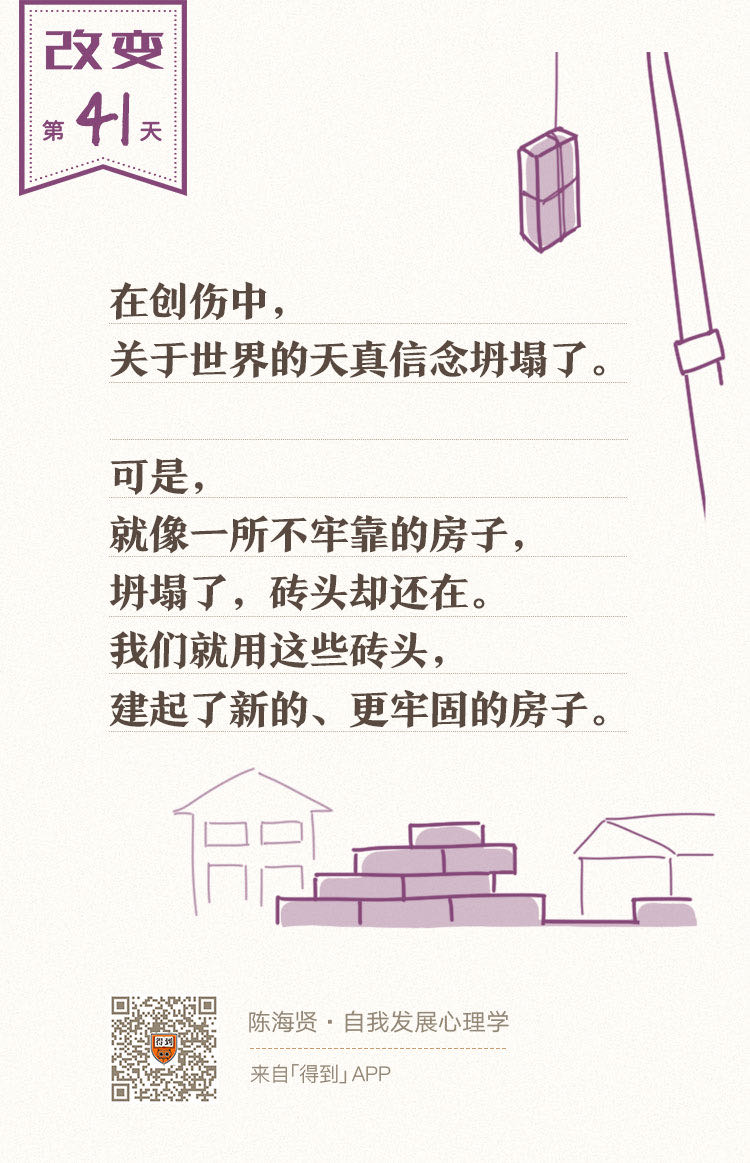 在创伤中,关于世界的一些天真的信念坍塌了。可是,就像一所不牢靠的房子,它坍塌了以后,建造房子的砖头却还在,我们就用这些砖头,建起了新的,更牢固的房子。