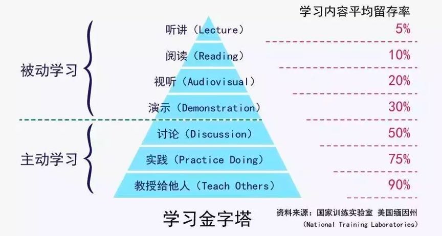 再次强调一下,这个世界上的学习只有两种,一种是被动学习,一种是主动学习。听课,看书,看视频,看别人的演讲,这些统统都是被动学习,知识的留存度最多只有 30%,不信你问问自己,今天我的专栏中,你记住了多少?而与别人讨论,实践和传授给别人,是主动学习,其可以让你掌握知识的 50% 到 90% 以上。