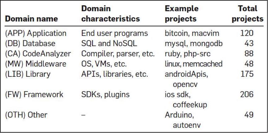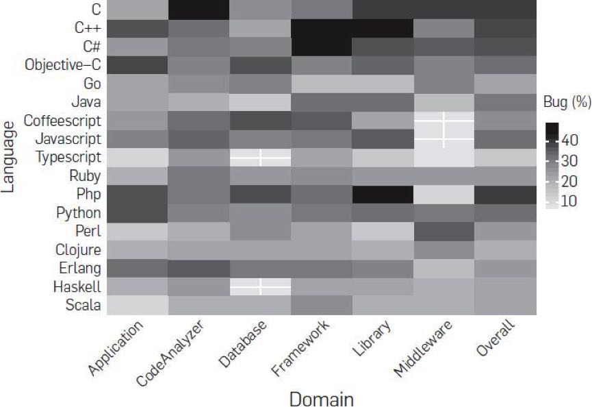 第三,研究者想搞清是否 bug 数会和软件的领域相关。比如,业务型的,中间件型、框架、lib,或是数据库。研究表明,并没有什么相关性。下面这个图是各个语言在不同领域的 bug 率。