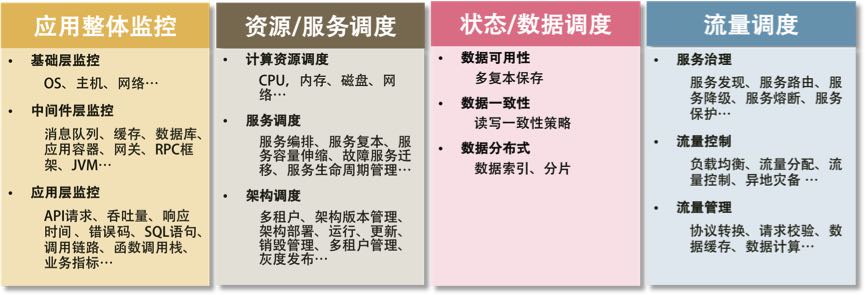 而最后一项——开发和运维的自动化,是需要把前四项都做到了,才有可能实现的。所以,最为关键是下面这四项技术,即应用整体监控、资源和服务调度、状态和数据调度及流量调度,它们是构建分布式系统最最核心的东西。