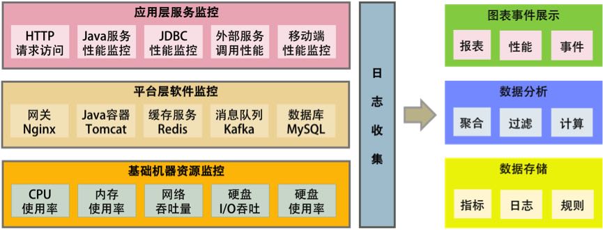 应用层:监控应用层的使用。比如:HTTP 访问的吞吐量、响应时间、返回码,调用链路分析,性能瓶颈,还包括用户端的监控。
