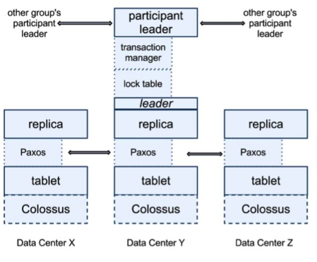 在 tablet 上层通过 Paxos 协议进行分布式跨数据中心的一致性数据同步。Paxos 会选出一个 replica 做 Leader,这个 Leader 的寿命默认是 10s,10s 后重选。Leader 就相当于复制数据的 master,其他 replica 的数据都是从它那里复制的。读请求可以走任意的 replica,但是写请求只有去 Leader。这些 replica 统称为一个 Paxos Group。