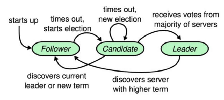 Raft 协议中有一个状态机,每个结点会有三个状态,分别是 Leader、Candidate 和 Follower。Follower 只响应其他服务器的请求,如果没有收到任何信息,它就会成为一个 Candidate,并开始进行选举。收到大多数人同意选票的人会成为新的 Leader。