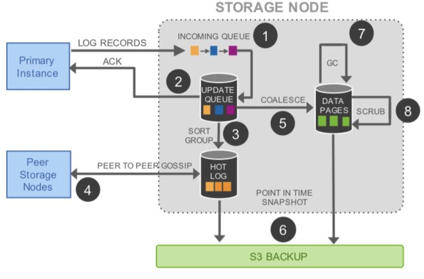 对于存储服务的设计,核心的原理就是 latency 一定要低,毕竟写 6 个 copy 是一件开销很大的事。所以,基本上来说,Aurora 用的是异步模型,然后拼命地做并行处理,其中用到的也是 Gossip 协议。如下所示。