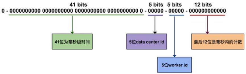 在全局唯一 ID 的算法中,这里介绍一个 Twitter 的开源项目 Snowflake。它是一个分布式 ID 的生成算法。其核心思想是,产生一个 long 型的 ID,其中: