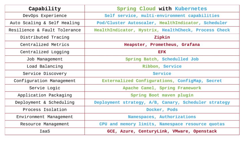 上面这张图中,对于所有的特性,都列举了一些相关的软件和一些设计的重点,其中红色的是运维层面的和 Spring Cloud 和 Kubernetes 不相关的,绿色的 Spring Cloud 提供的开发框架,需要作开发,蓝色的是 Kubernetes 相关的重要功能。