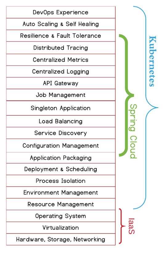 下图是微服务所需的关键技术,以及这些技术中在 Spring Cloud 和 Kubernetes 的涵盖面。