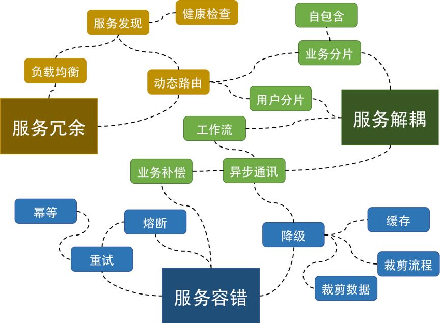冗余服务。通过冗余服务的复本数可以消除单点故障。这需要服务发现,负载均衡,动态路由和健康检查四个功能或组件。