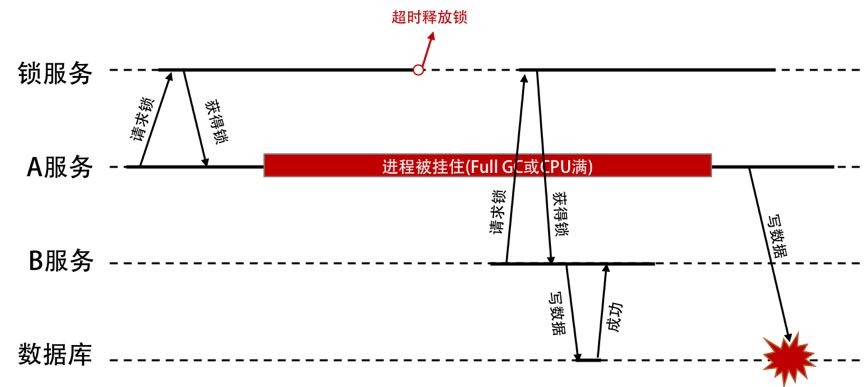 然后,我们的锁服务因为怕死锁,就在一定时间后,把锁给释放掉了。