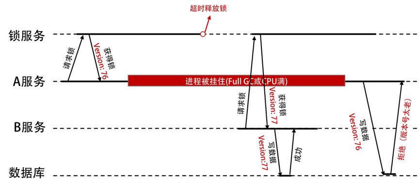 如果锁服务自动解锁了,新的进程就拿到锁了,但之前的进程以为自己还有锁,那么就出现了两个进程拿到了同一个锁的问题,它们在更新数据的时候就会产生问题。对于这个问题,我想说: