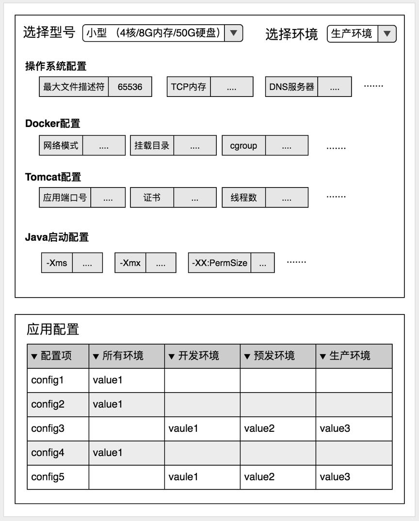 我们可以看到,其中有些配置是通过模板来选择的,有的配置需要在不同环境下配置不同值。所以,还需要一个配置管理的工具,可能是命令行的,也可以是 Web 的。这个工具的界面在文本中(下面这个 UI 的 mockup 只是想表明一个模型)。