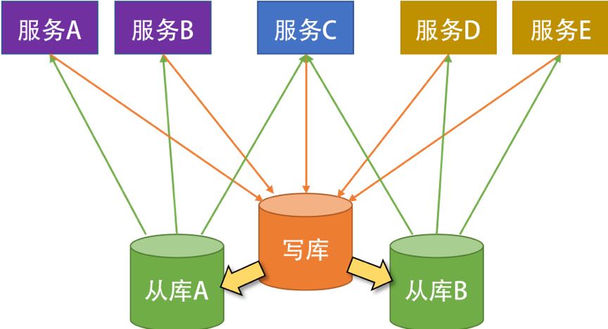 如下图所示,数据库只有一个写库,有两个读库,所有的服务都写一个数据库。对于读操作来说,服务 A 和服务 B 走从库 A,服务 D 和服务 E 走从库 B,服务 C 在从库 A 和从库 B 间做轮询。