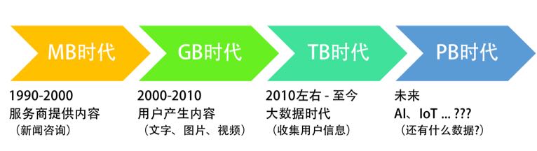 从一开始,我们处在 MB 时代,那个时候,电脑也是几百兆的硬盘就够了。因为那个时候的信息量不够大,只有内容服务提供商在提供内容,他们主要以新闻资讯为主,所以数据还不多。