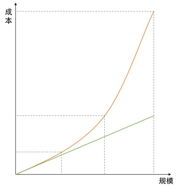 在这个图中,我们可以看到,当需要处理的数据或是用户请求的规模越来越大时,我们的成本是呈现快速上升的曲线,而不是一个线性上升的成本关系。