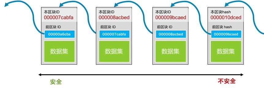 越旧的区块的篡改会造成越大面积的修改,于是越旧的区块就不容易篡改,就越安全。反之,越新的区块就越不安全。