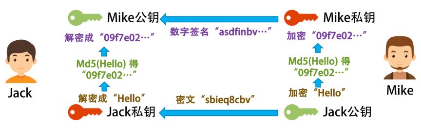 我用我的私钥解密 Mike 发给我的密文,然后用 Mike 的公钥解密其数字签名得到 Digest。然后,我用 SHA 或 MD5 对解开的密文做 Hash。如果结果和 Digest 一致,就说明,这个信息是 Mike 发给我的,没有人更改过。
