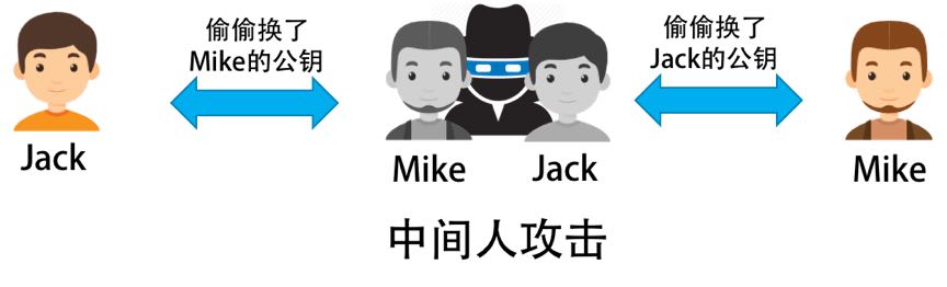 于是,对于 Jack 来看,因为他用了黑客的公钥,而不是 Mike 的,那么对他来说,他就以为信息来自 Mike,于是黑客可以用自己的私钥伪装成 Mike 给 Jack 通信。反之亦然,于是黑客就可以在中间伪装成 Jack 或 Mike 来通信,这就是中间人攻击。如下图所示。