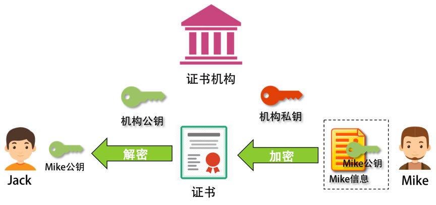 这个时候就比较麻烦了。Mike 看到有人在伪造他的公钥,想了想,他只能和 Jack 找了个大家都相信的永不作恶的权威的可信机构来认证他的公钥。这个权威机构,用自己的私钥把 Mike 的公钥和其相关信息一起加密,生成一个证书。