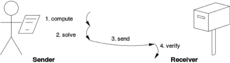 简单说来,Hashcash 一开始要求邮件发送方对邮件头(其中包括时间和收件人地址)计算一个 160bit 的 SHA-1 哈希值。其前面需要有 5 个零,也就是 20bit 的 0。接收端会检查这个事。
