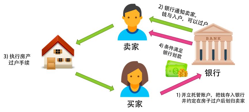 于是银行就出来了。买家先到银行开个户,把购房款全额存进去。这个账户和一般的账户不一样,这叫资金托管账户,钱一旦进入后,你就取不出来了,除非满足了某个条件。在开户时,房屋的买卖方和银行三方约定,一旦房产证从卖家过户到买家 30 天后没有纠纷,钱就划给卖家了。