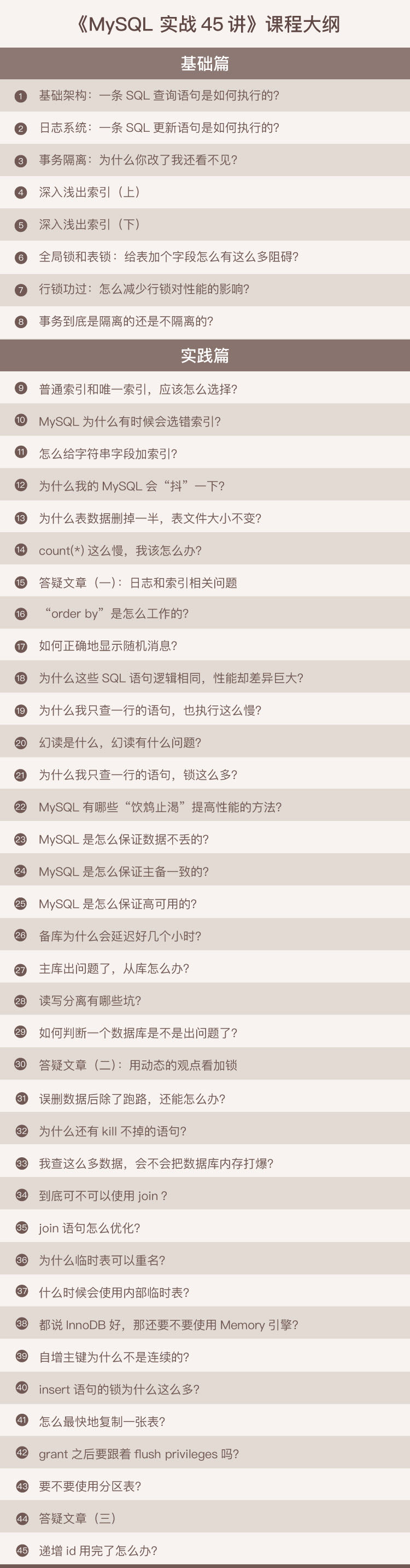 希望能以这样的方式,让你对 MySQL 的几条主线有一个整体的认识,并且了解基本概念。在之后的实践篇中,我会引用到这些主线的知识背景,并着力说明它们是怎样指导实践的。这样,你可以从点到线,再到面,形成自己的 MySQL 知识网络。