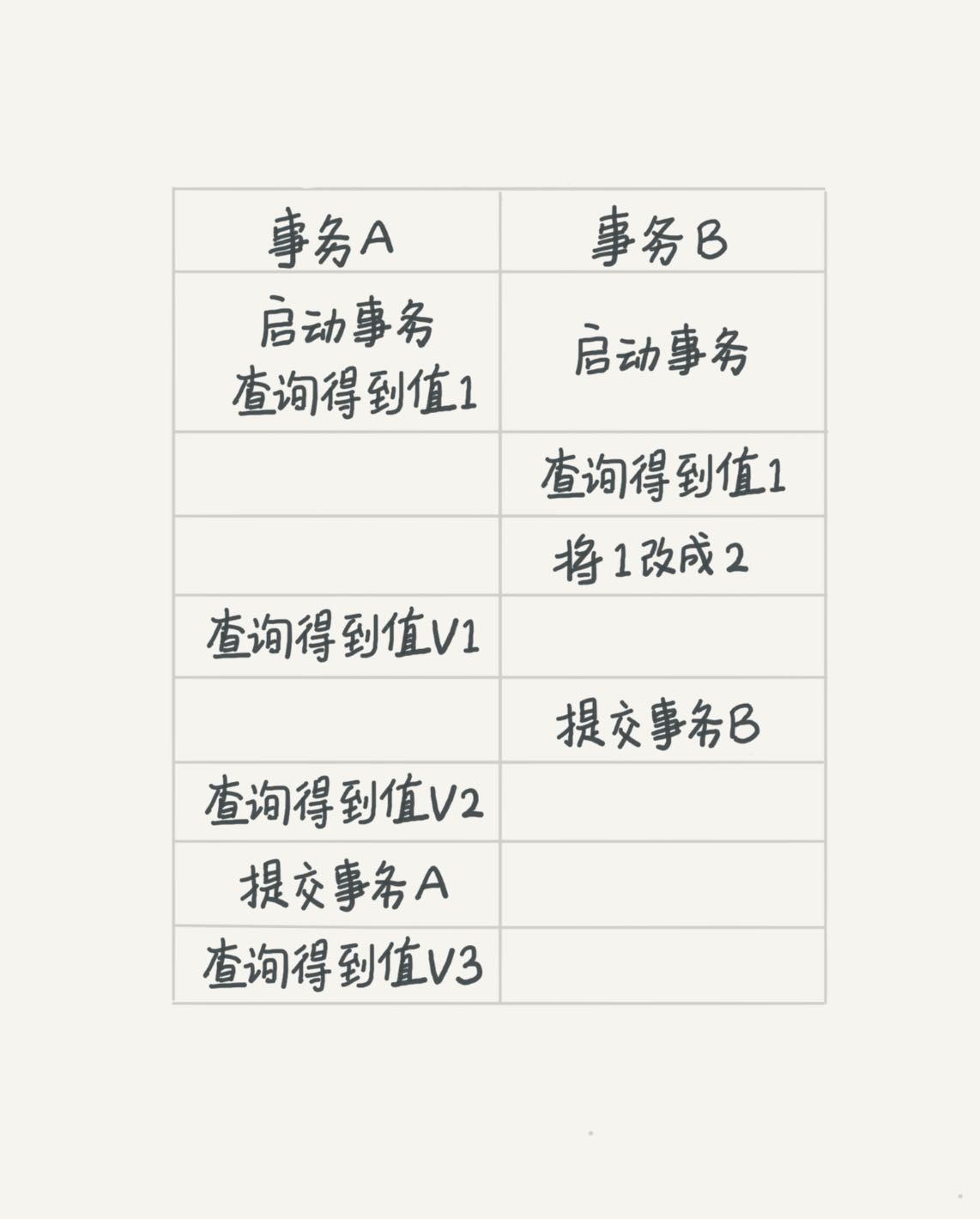 若隔离级别是“读提交”,则V1是1,V2的值是2。事务B的更新在提交后才能被A看到。所以, V3的值也是2。