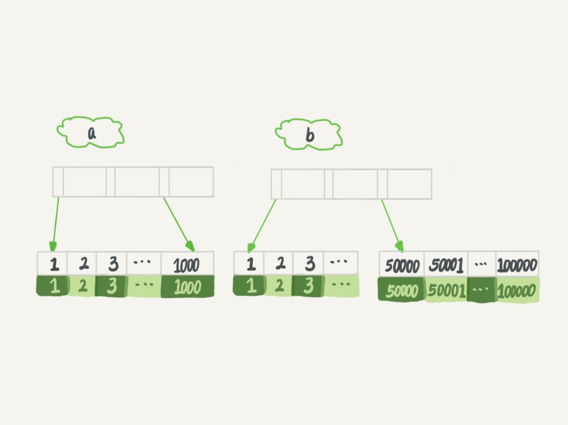 图7 a、b索引的结构图如果使用索引a进行查询,那么就是扫描索引a的前1000个值,然后取到对应的id,再到主键索引上去查出每一行,然后根据字段b来过滤。显然这样需要扫描1000行。