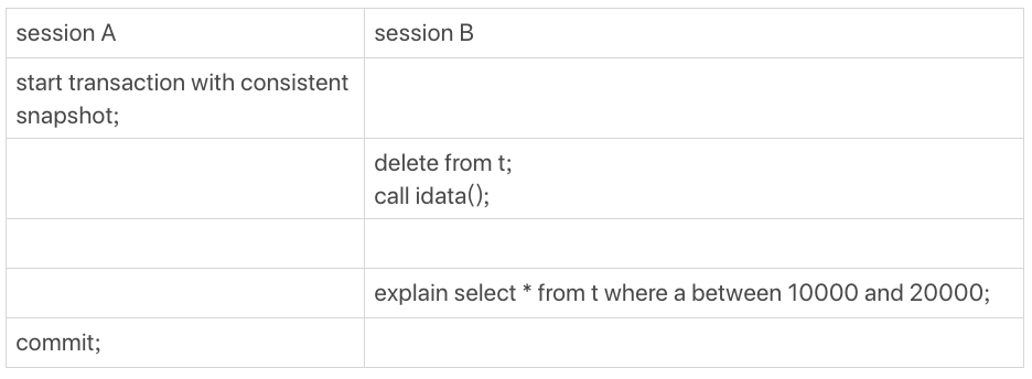 图2 session A和session B的执行流程这里,session A的操作你已经很熟悉了,它就是开启了一个事务。随后,session B把数据都删除后,又调用了 idata这个存储过程,插入了10万行数据。