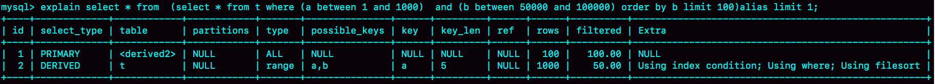 mysql> select * from (select * from t where (a between 1 and 1000) and (b between 50000 and 100000) order by b limit 100)alias limit 1;