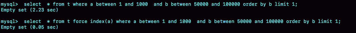 mysql> select * from t where (a between 1 and 1000) and (b between 50000 and 100000) order by b limit 1;