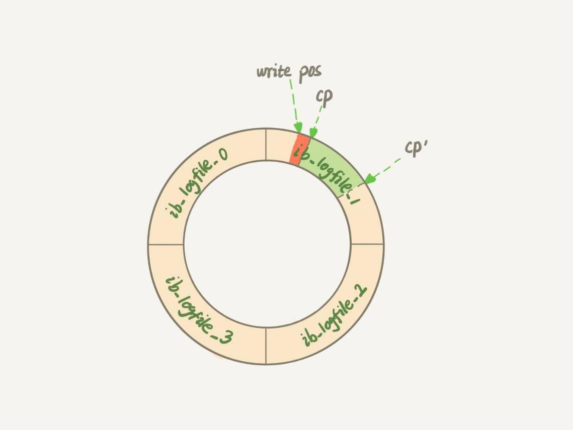 图2 redo log状态图checkpoint可不是随便往前修改一下位置就可以的。比如图2中,把checkpoint位置从CP推进到CP’,就需要将两个点之间的日志(浅绿色部分),对应的所有脏页都flush到磁盘上。之后,图中从write pos到CP’之间就是可以再写入的redo log的区域。