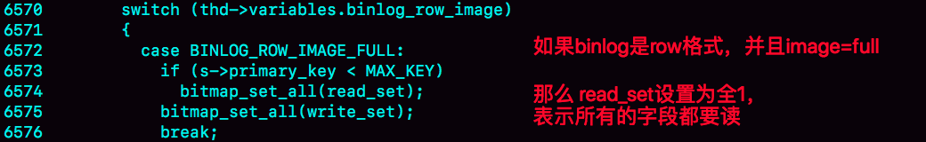 图15 binlog_row_image=FULL读字段逻辑类似的,@mahonebags 同学提到了timestamp字段的问题。结论是:如果表中有timestamp字段而且设置了自动更新的话,那么更新“别的字段”的时候,MySQL会读入所有涉及的字段,这样通过判断,就会发现不需要修改。