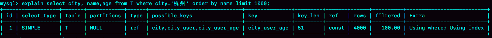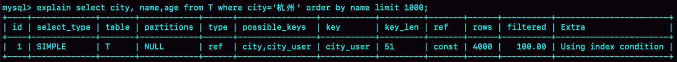 图9 引入(city,name)联合索引后,查询语句的执行计划从图中可以看到,Extra字段中没有Using filesort了,也就是不需要排序了。而且由于(city,name)这个联合索引本身有序,所以这个查询也不用把4000行全都读一遍,只要找到满足条件的前1000条记录就可以退出了。也就是说,在我们这个例子里,只需要扫描1000次。