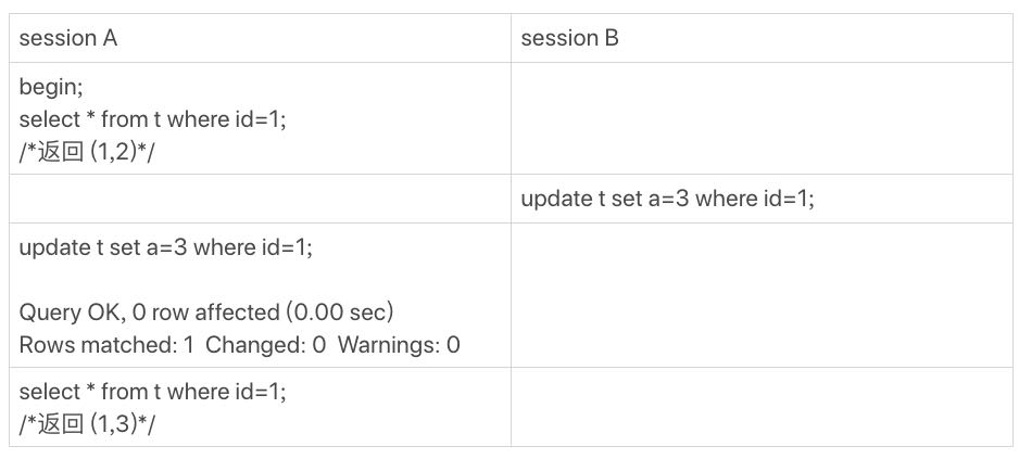 现在它返回的是(1,3),表示它看见了某个新的版本,这个版本只能是session A自己的update语句做更新的时候生成。(如果你对这个逻辑有疑惑的话,可以回顾下第8篇文章《事务到底是隔离的还是不隔离的?》中的相关内容)