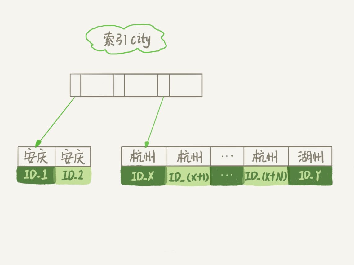 图2 city字段的索引示意图从图中可以看到,满足city='杭州’条件的行,是从ID_X到ID_(X+N)的这些记录。