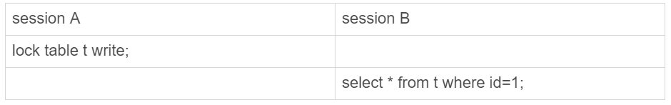 图3 MySQL 5.7中Waiting for table metadata lock的复现步骤session A 通过lock table命令持有表t的MDL写锁,而session B的查询需要获取MDL读锁。所以,session B进入等待状态。