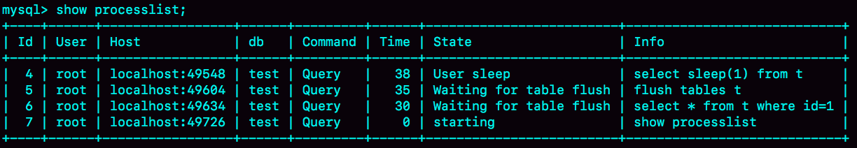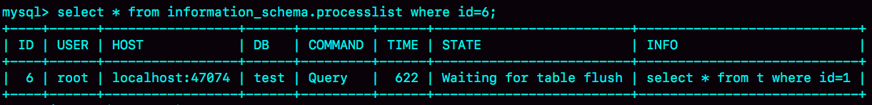 图 7 Waiting for table flush的show processlist 结果等行锁