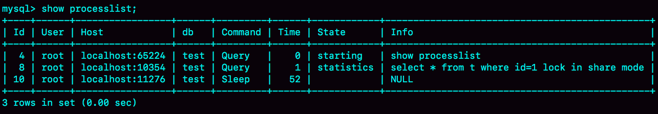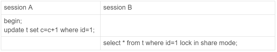 mysql> select * from t where id=1 lock in share mode;