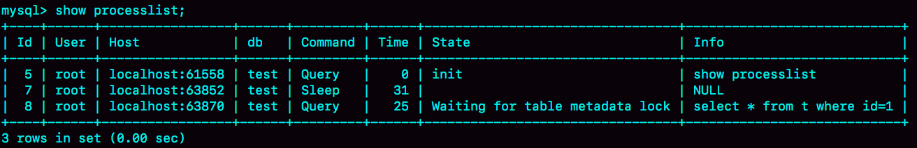 如图2所示,就是使用show processlist命令查看Waiting for table metadata lock的示意图。