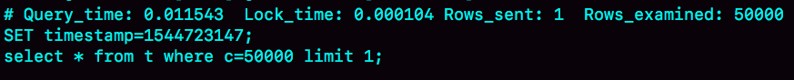 图11 全表扫描5万行的slow logRows_examined显示扫描了50000行。你可能会说,不是很慢呀,11.5毫秒就返回了,我们线上一般都配置超过1秒才算慢查询。但你要记住:坏查询不一定是慢查询。我们这个例子里面只有10万行记录,数据量大起来的话,执行时间就线性涨上去了。