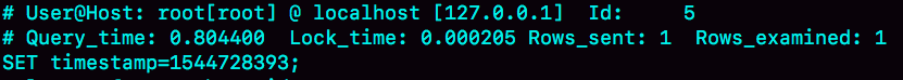 作为确认,你可以看一下慢查询日志。注意,这里为了把所有语句记录到slow log里,我在连接后先执行了 set long_query_time=0,将慢查询日志的时间阈值设置为0。