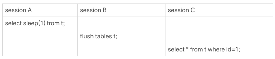 图6 Waiting for table flush的复现步骤在session A中,我故意每行都调用一次sleep(1),这样这个语句默认要执行10万秒,在这期间表t一直是被session A“打开”着。然后,session B的flush tables t命令再要去关闭表t,就需要等session A的查询结束。这样,session C要再次查询的话,就会被flush 命令堵住了。