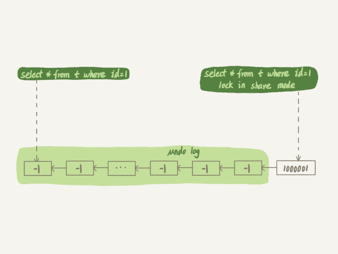 带lock in share mode的SQL语句,是当前读,因此会直接读到1000001这个结果,所以速度很快;而select * from t where id=1这个语句,是一致性读,因此需要从1000001开始,依次执行undo log,执行了100万次以后,才将1这个结果返回。