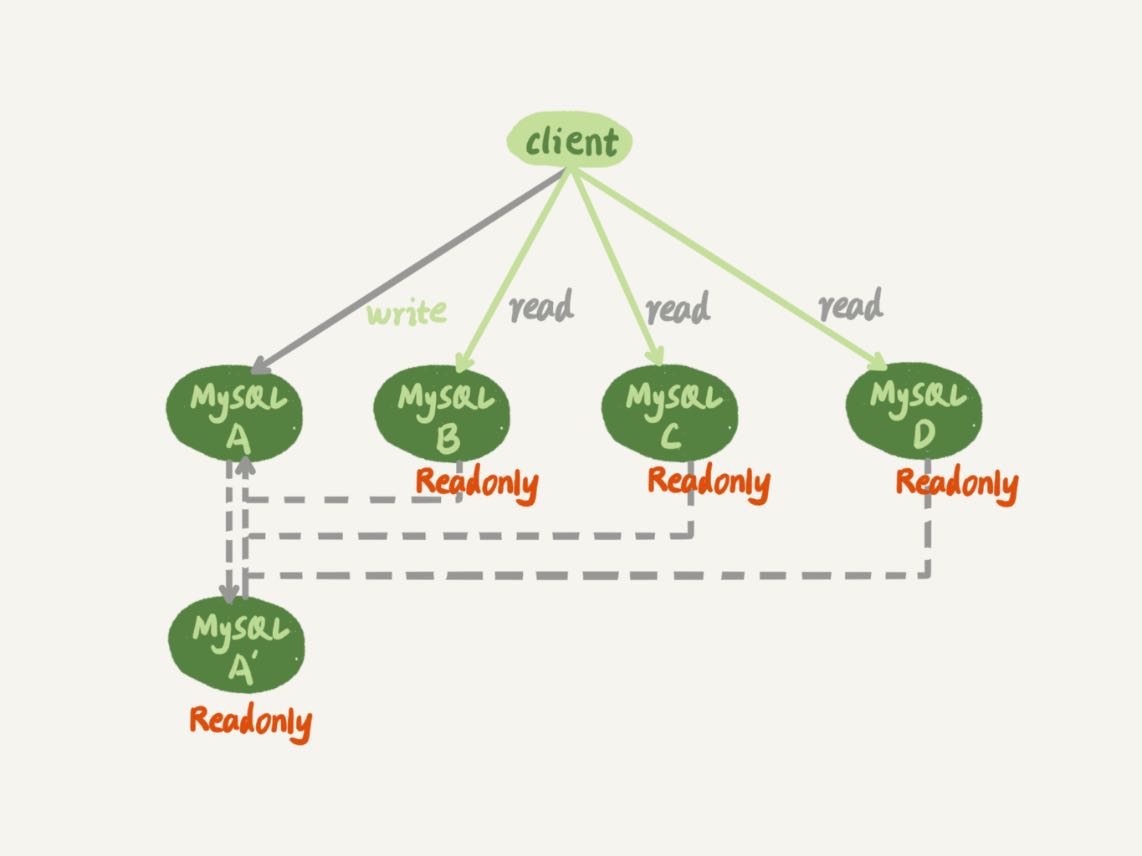 图1 一主多从基本结构图中,虚线箭头表示的是主备关系,也就是A和A’互为主备, 从库B、C、D指向的是主库A。一主多从的设置,一般用于读写分离,主库负责所有的写入和一部分读,其他的读请求则由从库分担。