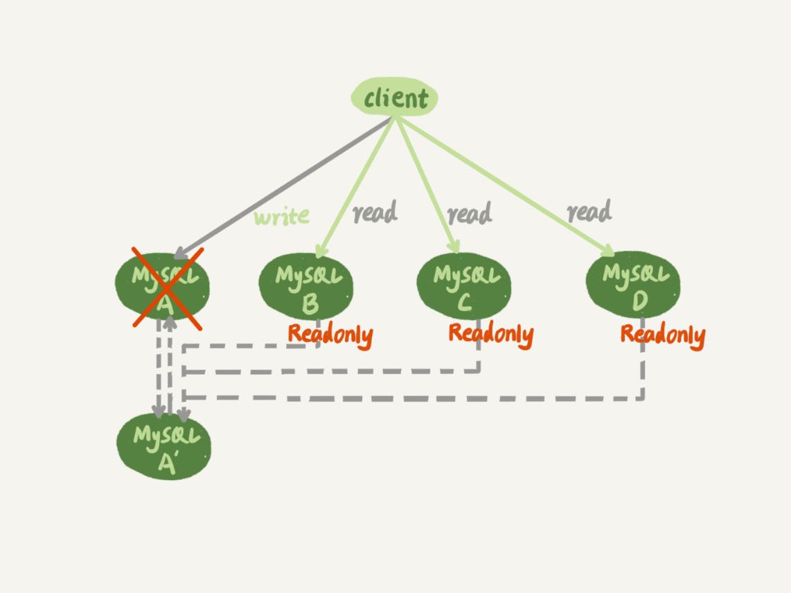图2 一主多从基本结构--主备切换相比于一主一备的切换流程,一主多从结构在切换完成后,A’会成为新的主库,从库B、C、D也要改接到A’。正是由于多了从库B、C、D重新指向的这个过程,所以主备切换的复杂性也相应增加了。