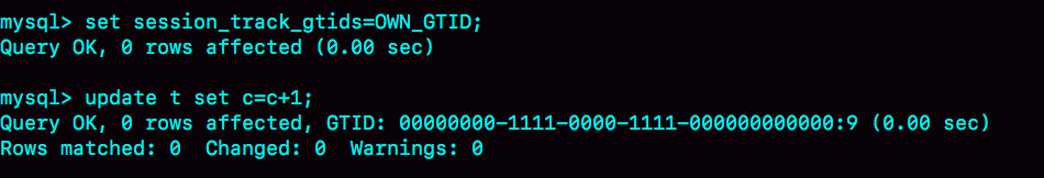 图9 显示更新事务的GTID--效果当然了,这只是一个例子。你要使用这个方案的时候,还是应该在你的客户端代码中调用mysql_session_track_get_first这个函数。
