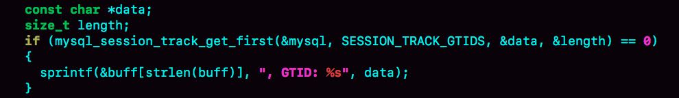 你只需要将参数session_track_gtids设置为OWN_GTID,然后通过API接口mysql_session_track_get_first从返回包解析出GTID的值即可。