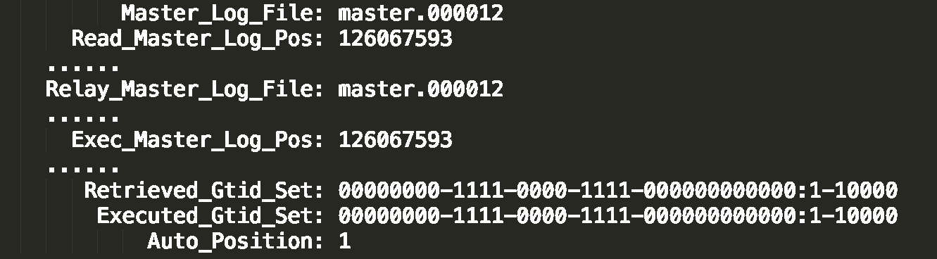 图3 show slave status结果现在,我们就通过这个结果,来看看具体如何通过对比位点和GTID来确保主备无延迟。