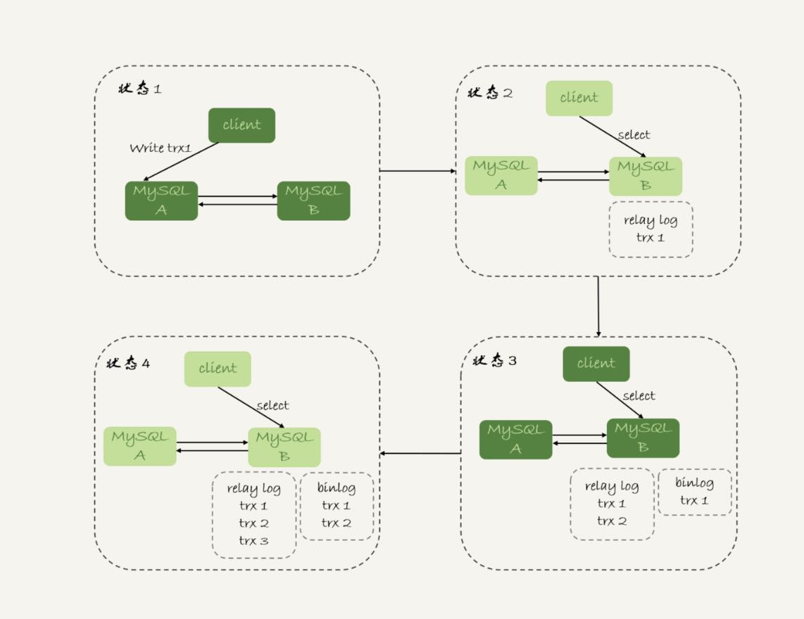 备库B一直到状态4都和主库A存在延迟,如果用上面必须等到无延迟才能查询的方案,select语句直到状态4都不能被执行。