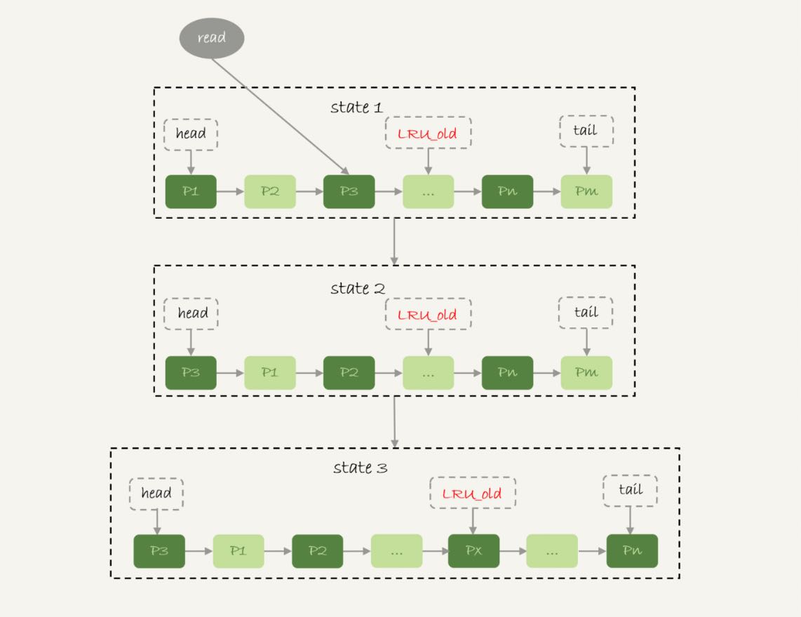 图7中状态1,要访问数据页P3,由于P3在young区域,因此和优化前的LRU算法一样,将其移到链表头部,变成状态2。